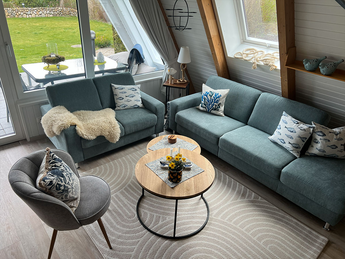 Im Erdgeschoss lädt der offen gestaltete Wohnraum zum Verweilen ein. Mit einer Esszimmer-Garnitur und einer Sofaecke ist sicher für jeden ein Platz dabei.