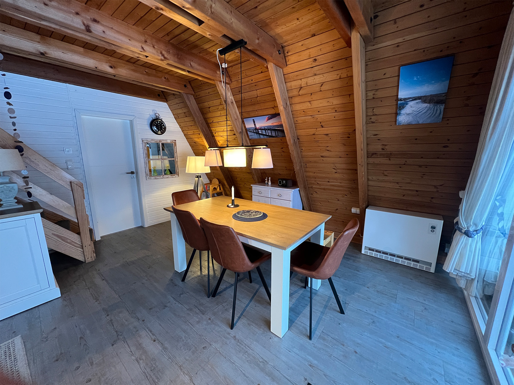 Dem Alltag entfliehen können Sie Sommer wie Winter in unserem gemütlichen Nurdachhaus. Im Erdgeschoss lädt der offen gestaltete Wohnraum zum Verweilen ein. Mit einer Esszimmer-Garnitur und einer Sofaecke ist sicher für jeden ein Platz dabei. Die Küche ist direkt an das Wohnzimmer angeschlossen, so kann in angenehmer Atmosphäre gekocht werden. Wem das nicht liegt, empfehlen wir eines der zahlreichen Restaurants im Ferienzentrum. Das helle Bad vervollständigt die untere Etage mit Dusche, WC und Waschtisch.